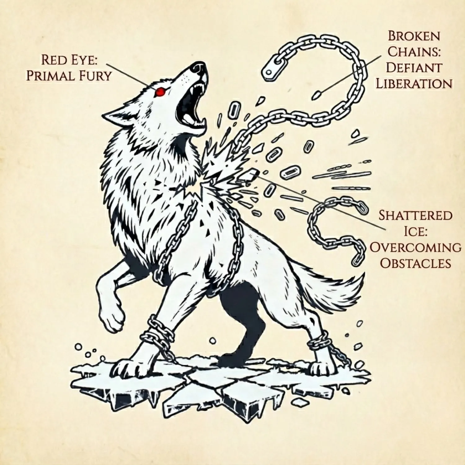 Fenrir was bound on an island, and Ragnarok involves the breaking of the world itself. The fractured ice symbolizes the moment when the old order shatters, foundations crack, and chaos is unleashed.