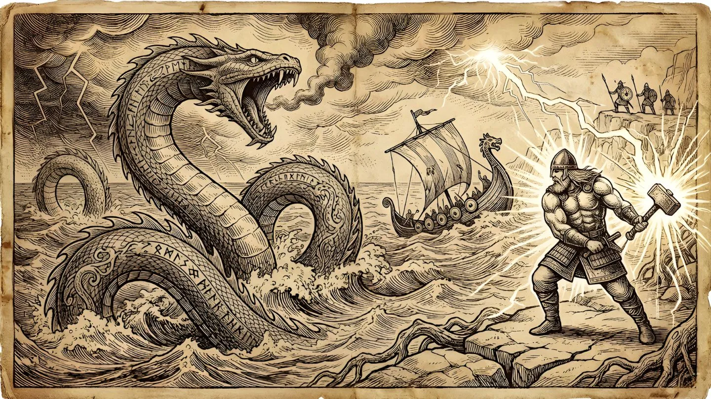 Cast into the deep ocean by Odin, the middle child of Loki grew until he encircled the entirety of Midgard, finally biting his own tail to hold the world together. Jörmungandr is the World Serpent, the literal boundary of the known earth. In Norse cosmology, he is not merely a monster but a cosmic necessity; as long as he holds his tail, the center holds. When he releases his grip, the seas will boil and Ragnarok begins.