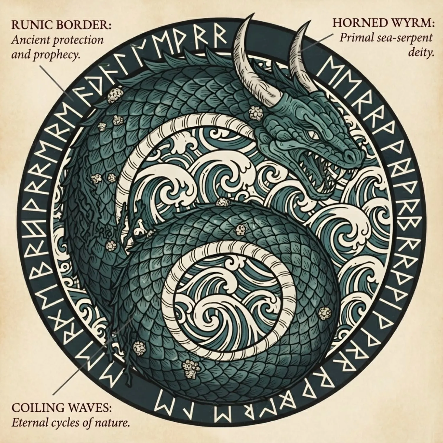 This design utilizes the “Mode 2: Ornate Narrative” approach, organizing complex mythology into a clean, symmetrical emblem. The composition features the World Serpent knotted in a perfect circle, surrounded by a border of Elder Futhark runes that ground the piece in historical authenticity. The illustration style borrows from traditional Nordic woodcarving, using heavy linework to define the overlapping scales and the churning waves of the Midgard sea.