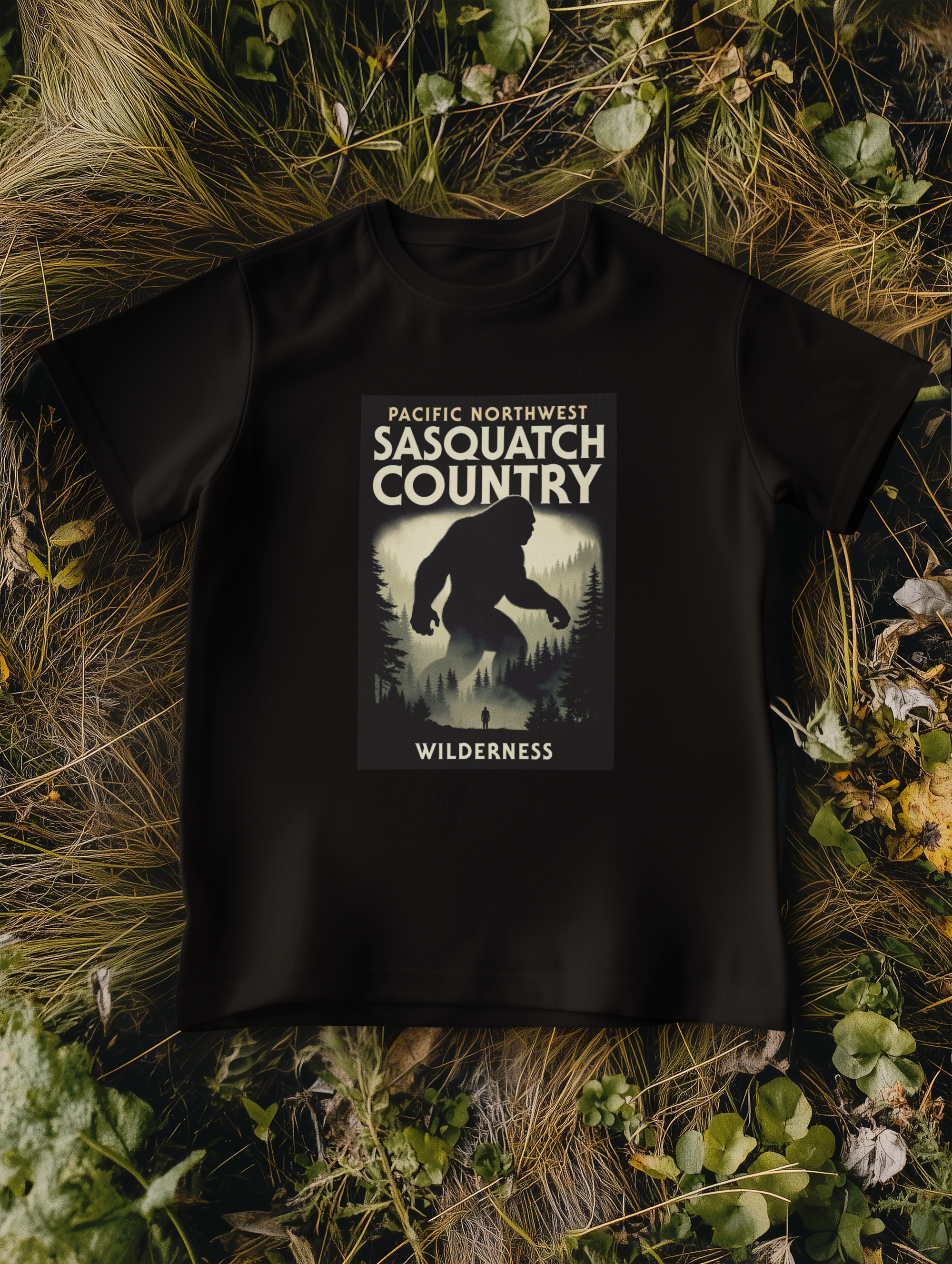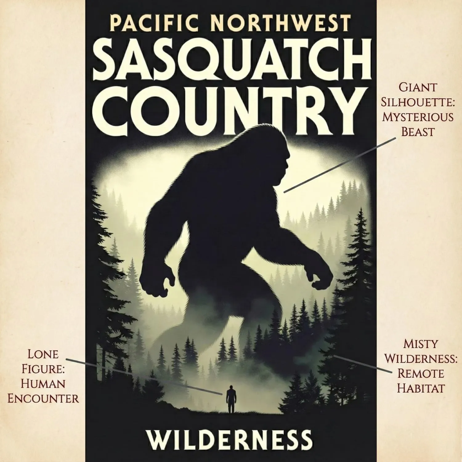 This design embraces the “Cryptidcore” aesthetic through the lens of vintage typography and layout. Modeled after mid-century National Park posters, the composition features a bold, high-contrast silhouette of the creature towering over a solitary human figure, emphasizing the awe-inspiring scale of the legend. The typography “PACIFIC NORTHWEST SASQUATCH COUNTRY” utilizes robust, utilitarian sans-serif fonts typical of government signage and field guides, grounding the fantastical subject in reality.