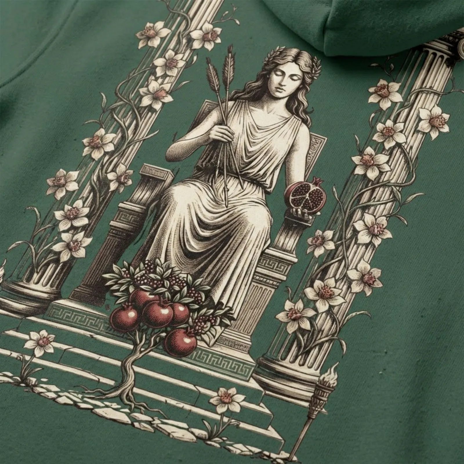 Hunter green was chosen for the garment to represent Persephone before her descent. The color of meadows, of spring, of the world she left behind but returns to. The duality lives in the contrast: spring-colored fabric, underworld-ruling imagery.