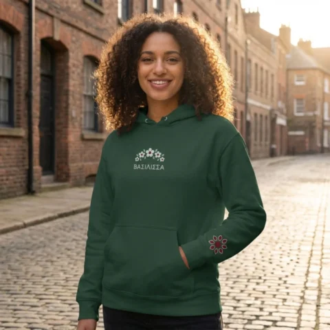 The chest placement features embroidered “ΒΑΣΙΛΙΣΣΑ” (Basilissa, “Queen” in Greek) crowned with a delicate floral arc. The embroidery adds dimensional texture, a premium detail that signals this is not standard streetwear. The Greek lettering roots the design in authentic mythology, not anglicized pop culture.