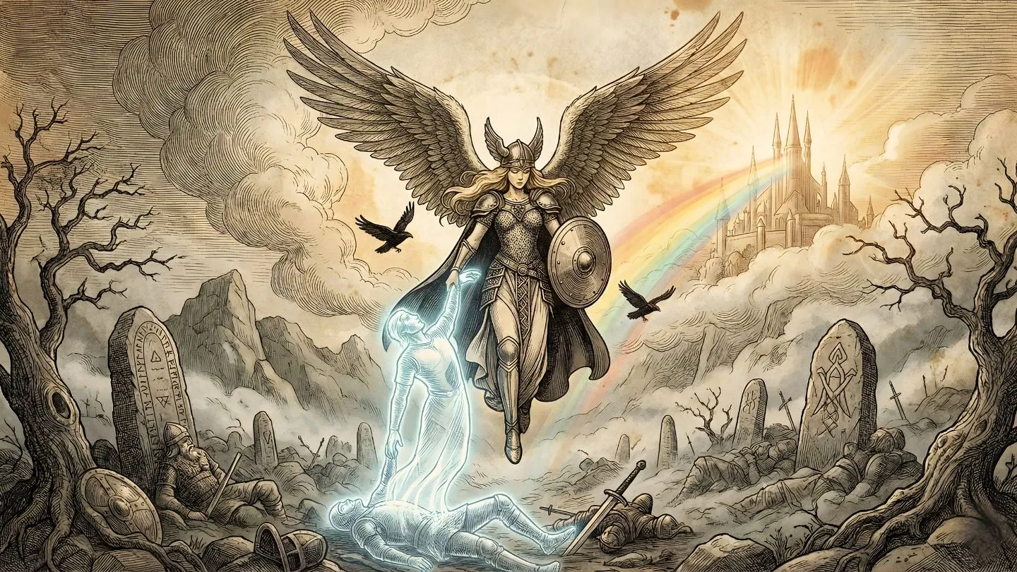 Valkyries were Odin's elite warriors who descended onto battlefields to select the bravest fallen warriors for Valhalla. "Chooser of the Slain" (Old Norse: kjรณsa valkyrja) describes their sacred duty to judge courage and honor, determining who earns eternal glory in Odin's hall.