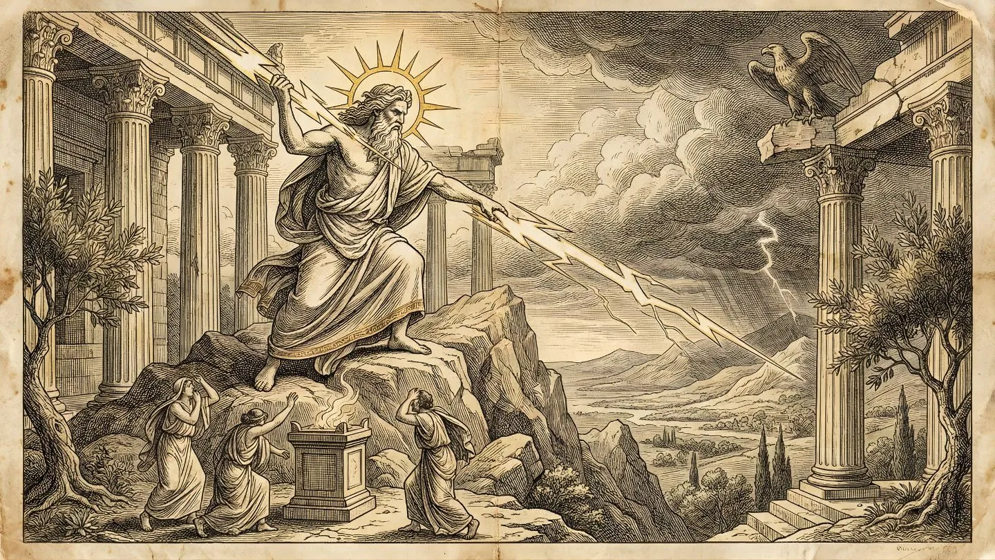 Zeus freed his siblings from Cronus's stomach, rallied the Cyclopes and Hundred-Handers, and waged a ten-year war called the Titanomachy. After victory, he cast the Titans into Tartarus and divided the cosmos with his brothers Poseidon and Hades, claiming the sky as his eternal domain.
