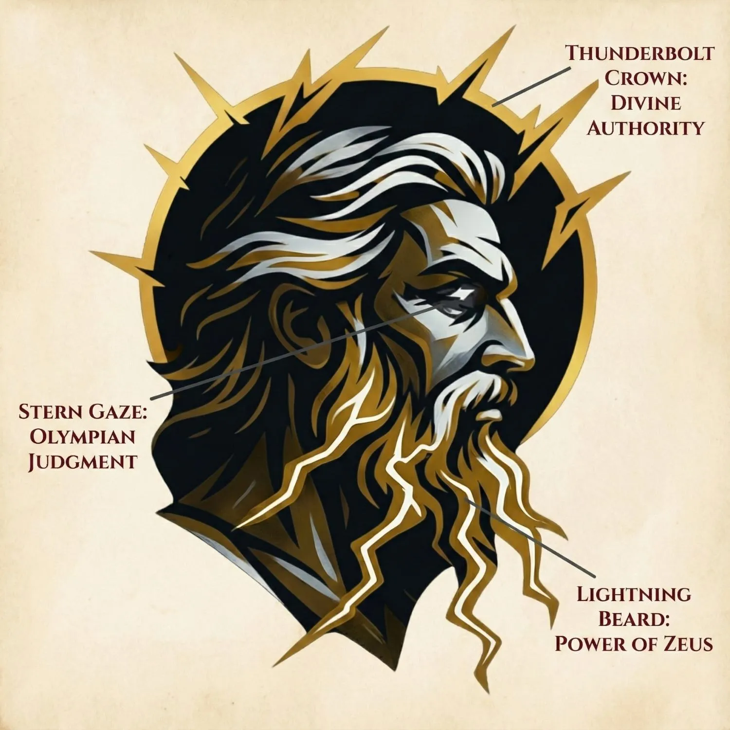 The radiating lightning crown represents Zeus's dual nature as both destroyer and illuminator. Gold symbolizes divine authority in ancient Greek art, the light of the gods. Each lightning bolt extends outward like sun rays, showing Zeus as the source of cosmic power from which all order flows.