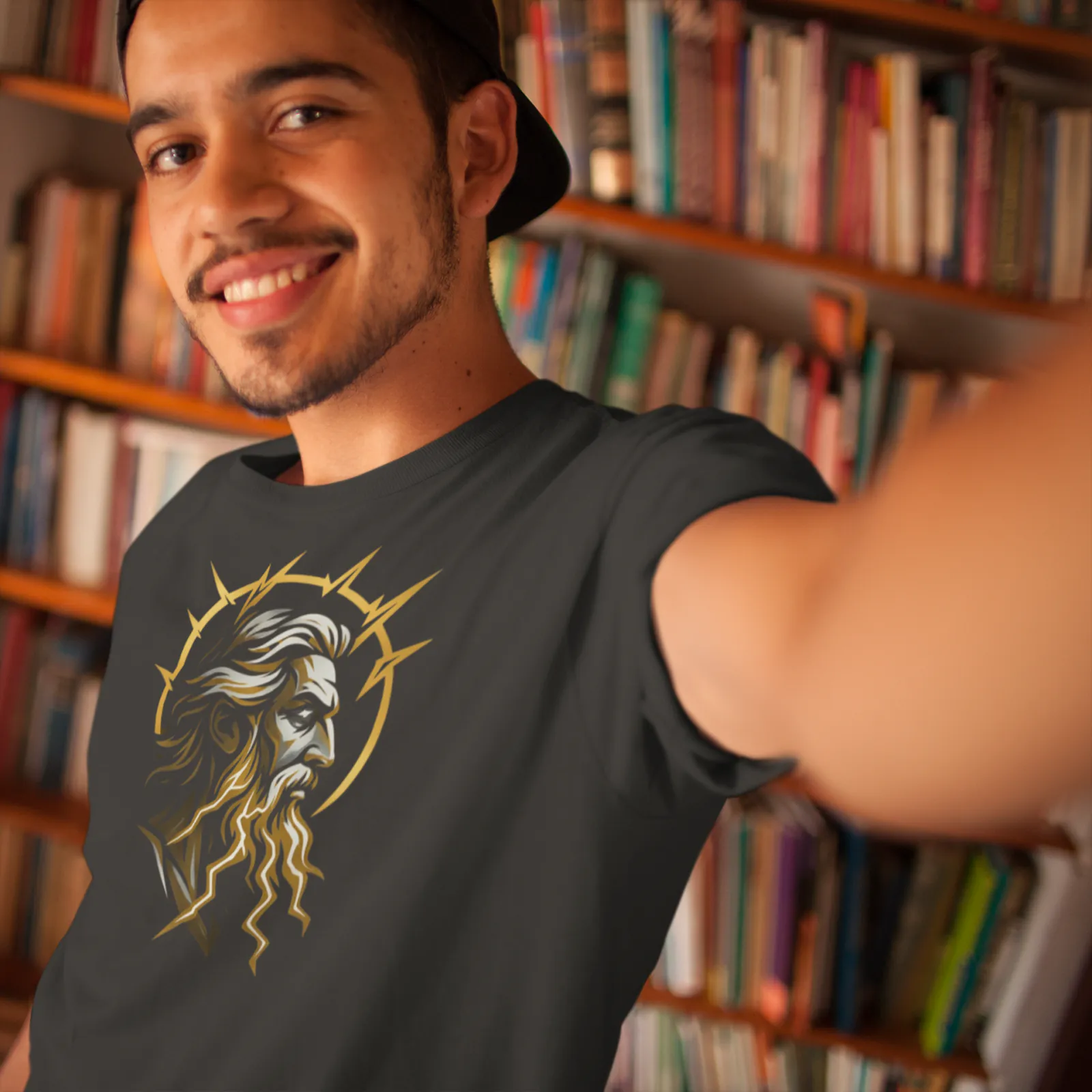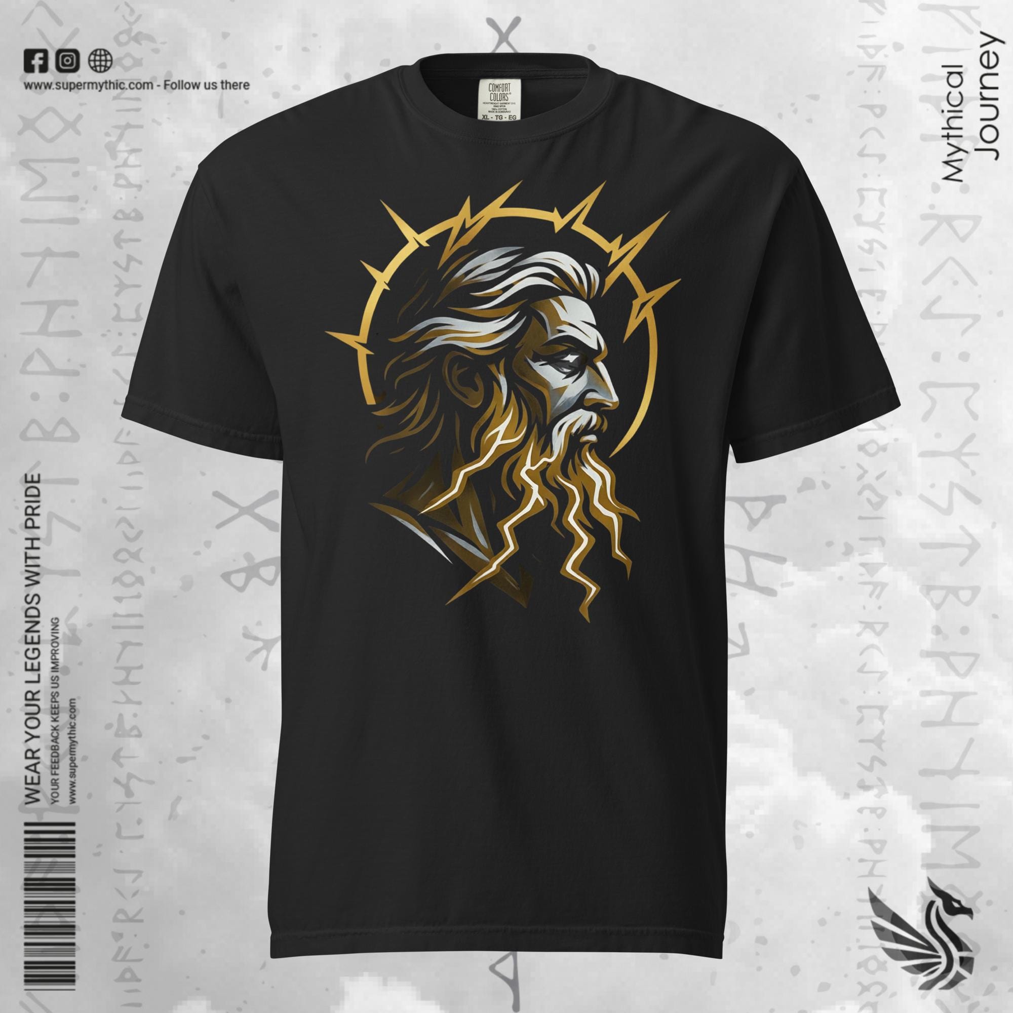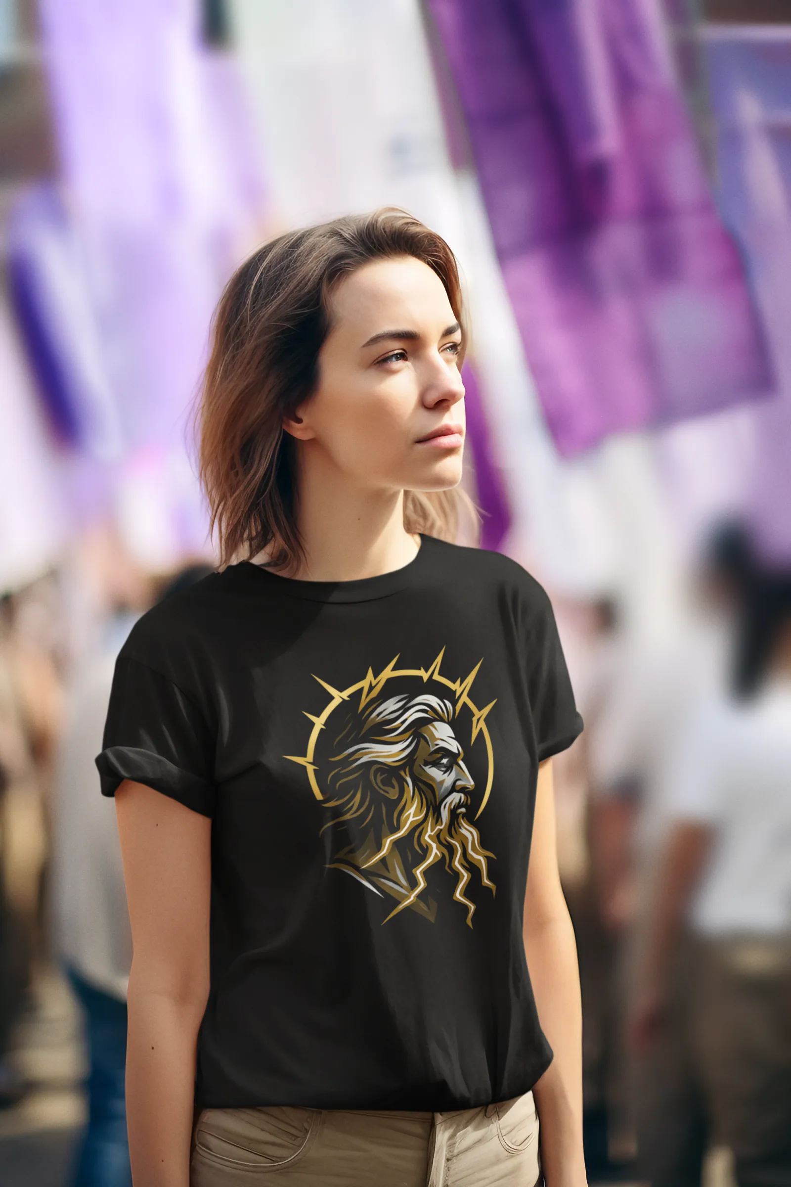 This design employs the “Mode 1: Bold Iconic” approach to create a striking portrait of divinity. The composition features a regal profile of Zeus rendered in the “Ancient Luxury” color palette. Deep gold and storm grey accents pop vividly against the black fabric. The beard and hair of the god transition seamlessly into stylized lightning bolts. This visual metaphor represents his intrinsic connection to the elemental forces of the sky.
